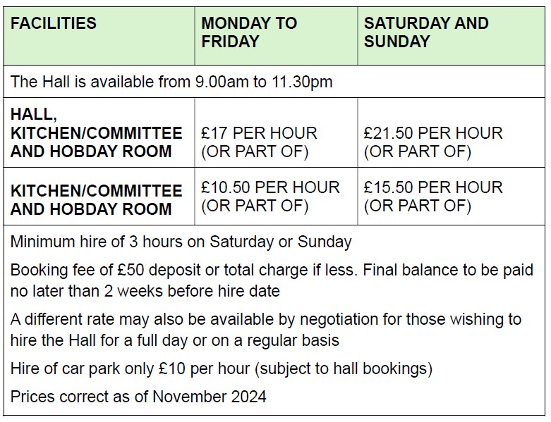 The hall can be hired between the hours of 9.00am to 11.30pm, Monday to Sunday.